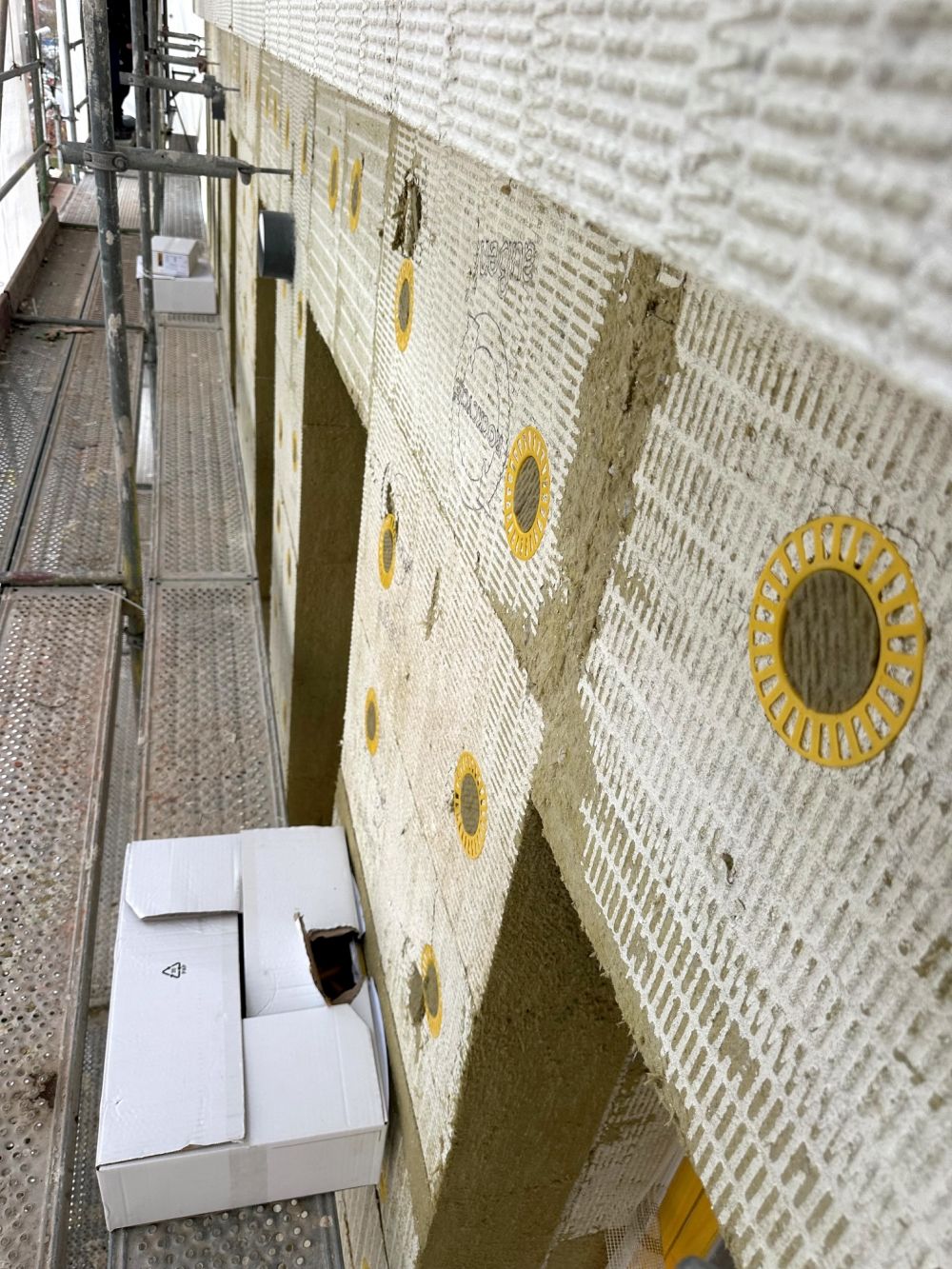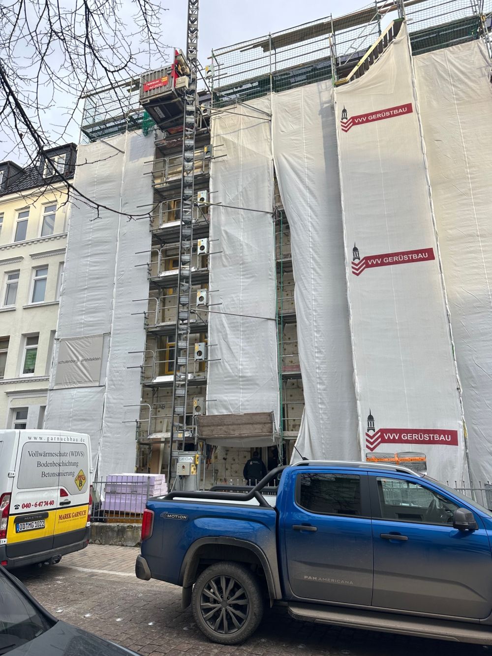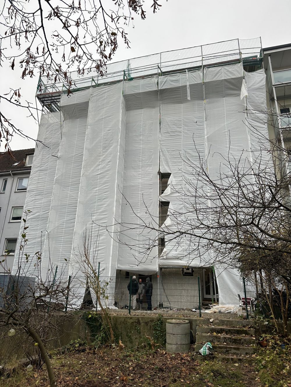 Auf dem bestehenden Gebäude wird zusätzlicher Wohnraum durch eine leichte Dachaufstockung geschaffen. Gleichzeitig erhält die Fassade eine energetische Sanierung inklusive moderner Dämmung und optimierter Anschlüsse, um den Energieverbrauch deutlich zu senken und die Gebäudehülle nachhaltig zu verbessern.