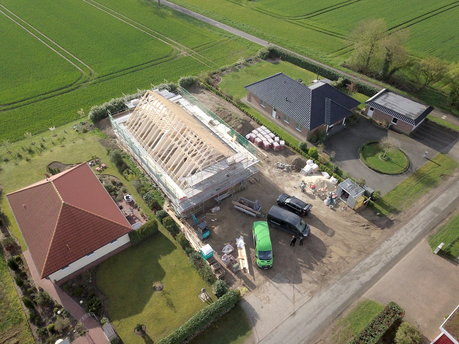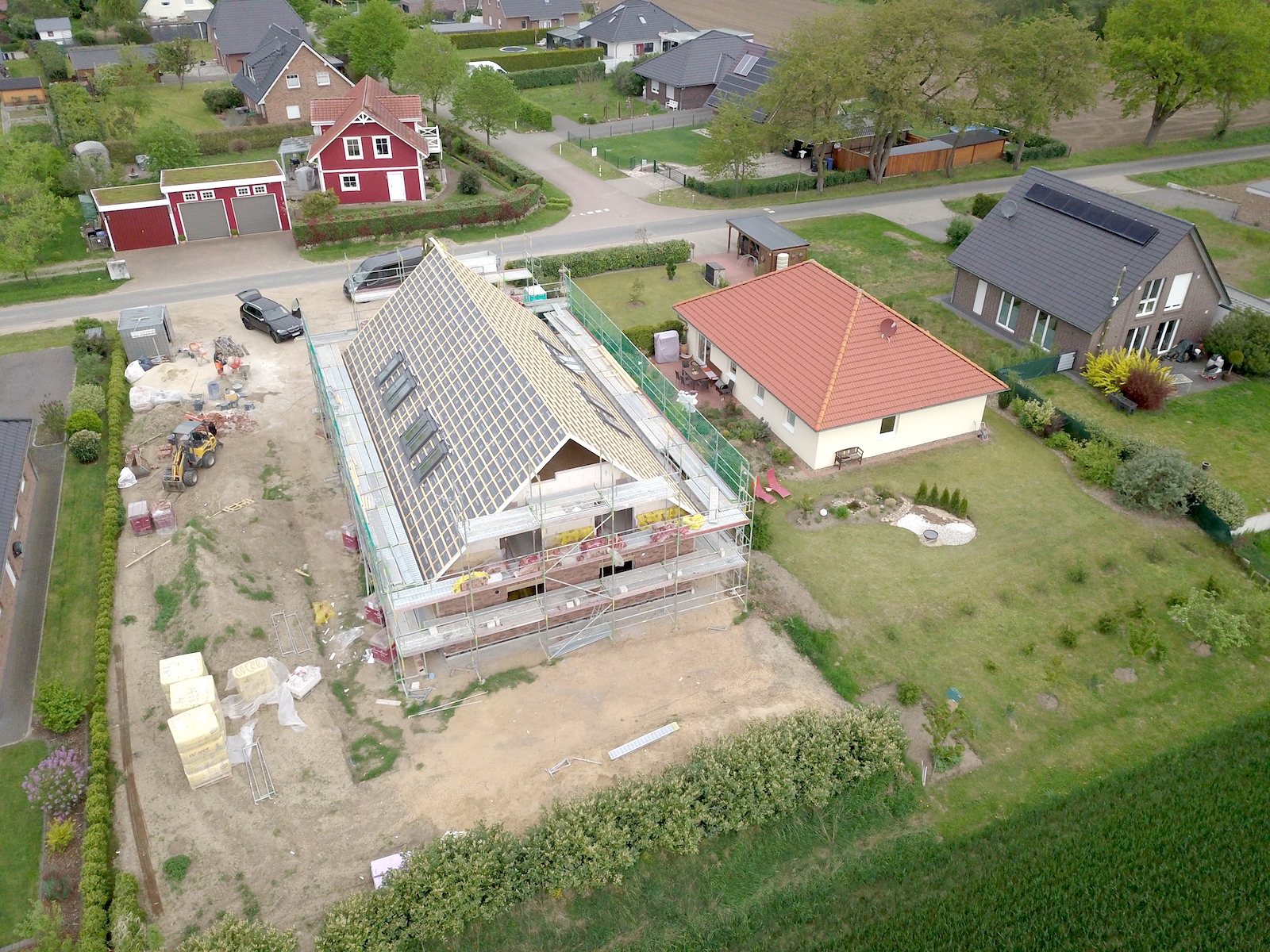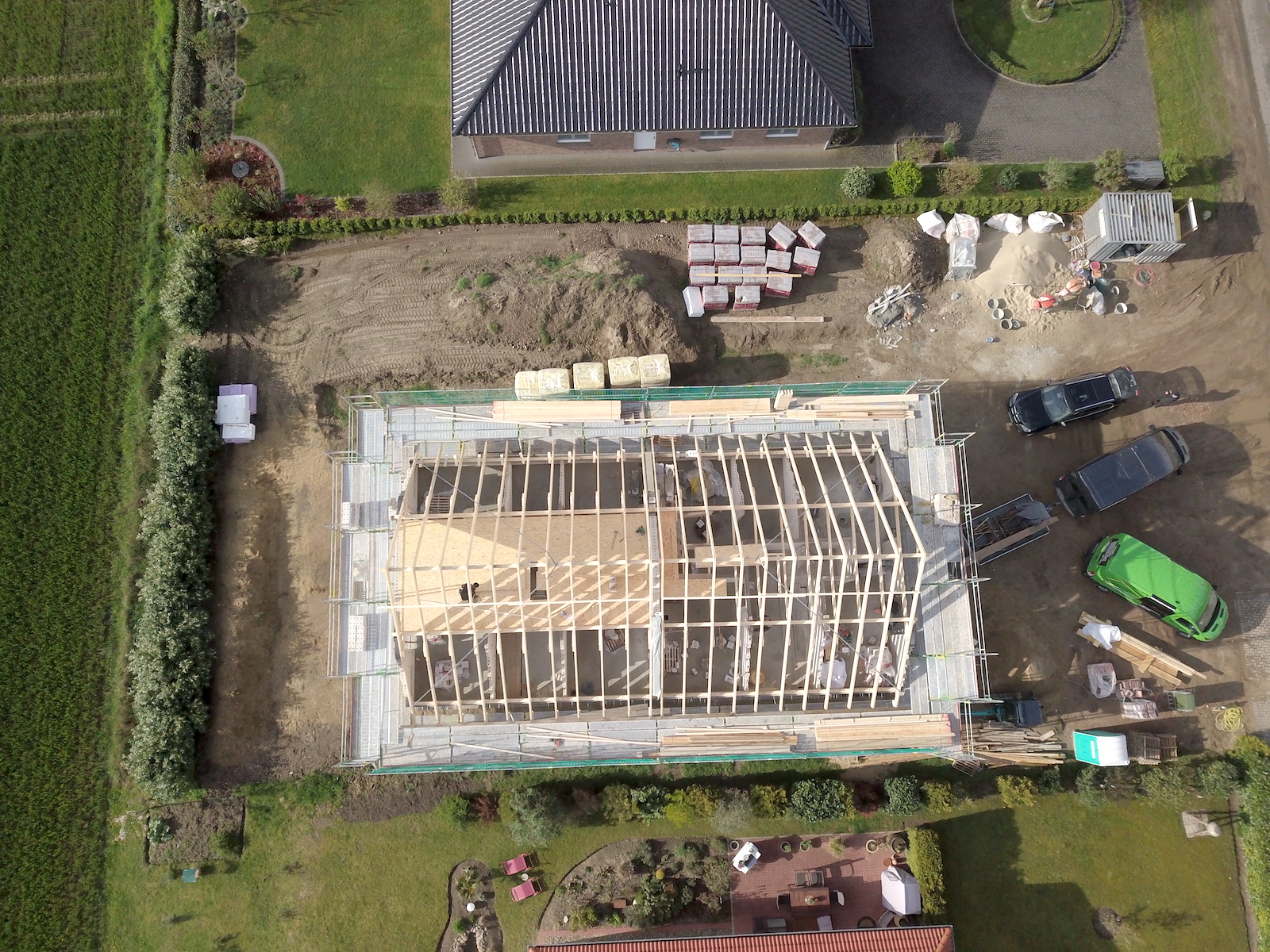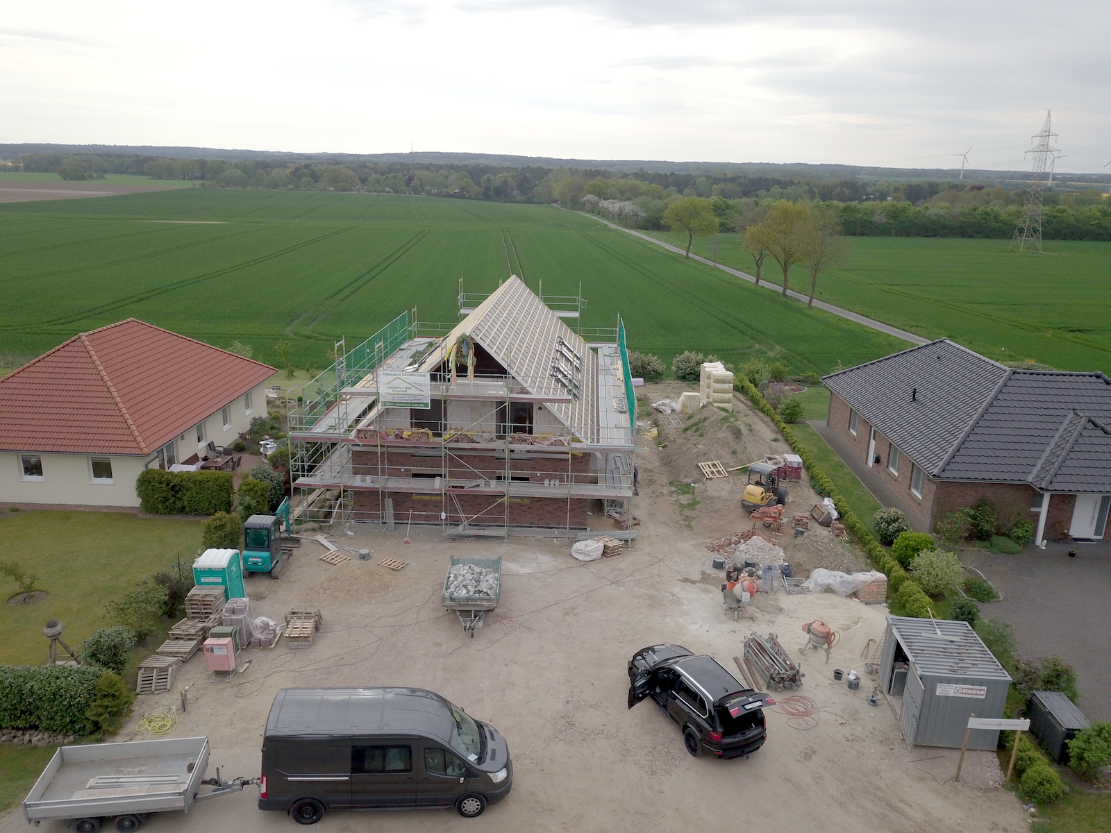 Bei dem Bauvorhaben handelt es sich um einen Neubau eines Zweifamilienhauses mit einer Carportanlage für vier Autos und zwei Abstellräumen. Das Carport erhält ein begrüntes Flachdach.